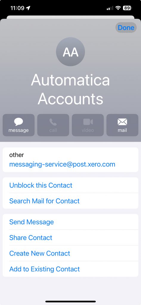 Going back into the email and tapping on the contact shows that the contact is blocked, and there is a button to Unblock this Contact.