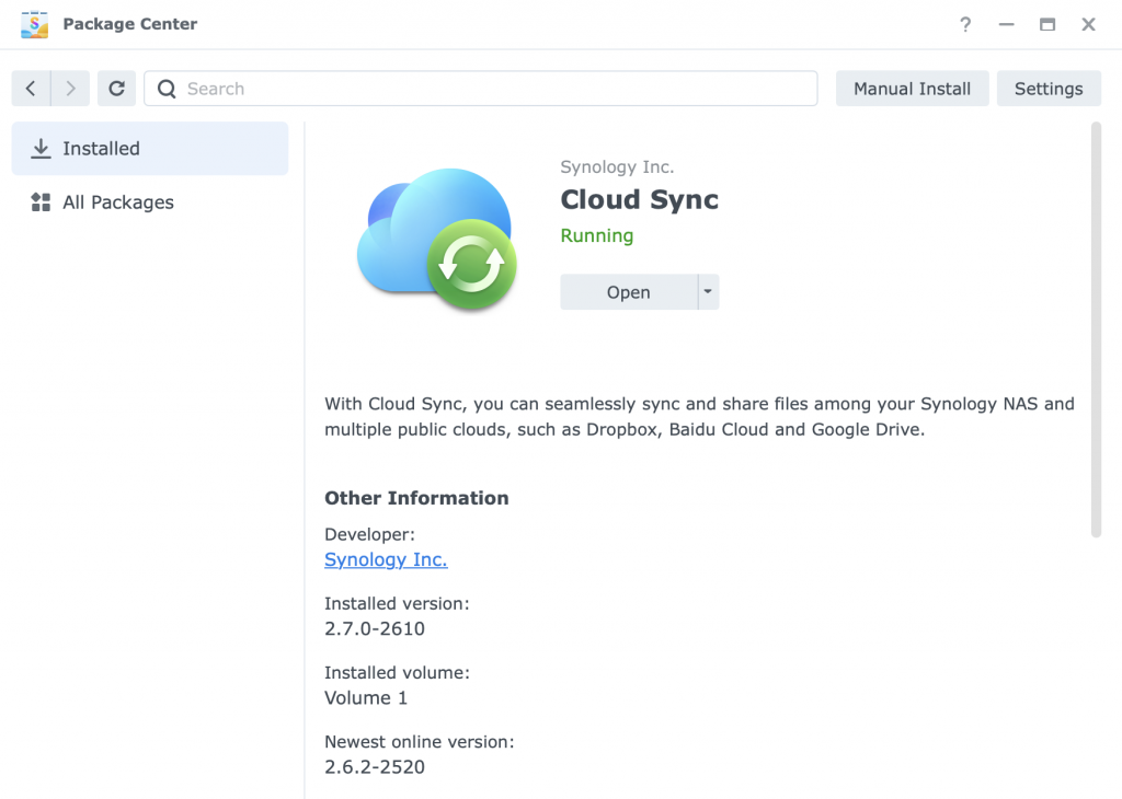 For some unknown reason, the latest Cloud Sync package that DSM seems to want to automatically update to is (as of 24 May 2024) 2.6.2 and this version does not work.